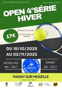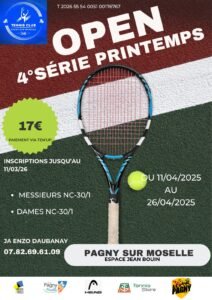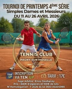 Le Club de Tennis de Pagny-sur-Moselle vous dévoile son calendrier des tournois à venir. Que vous soyez joueur licencié, amateur passionné ou simple spectateur, ces rendez-vous sont faits pour vous !